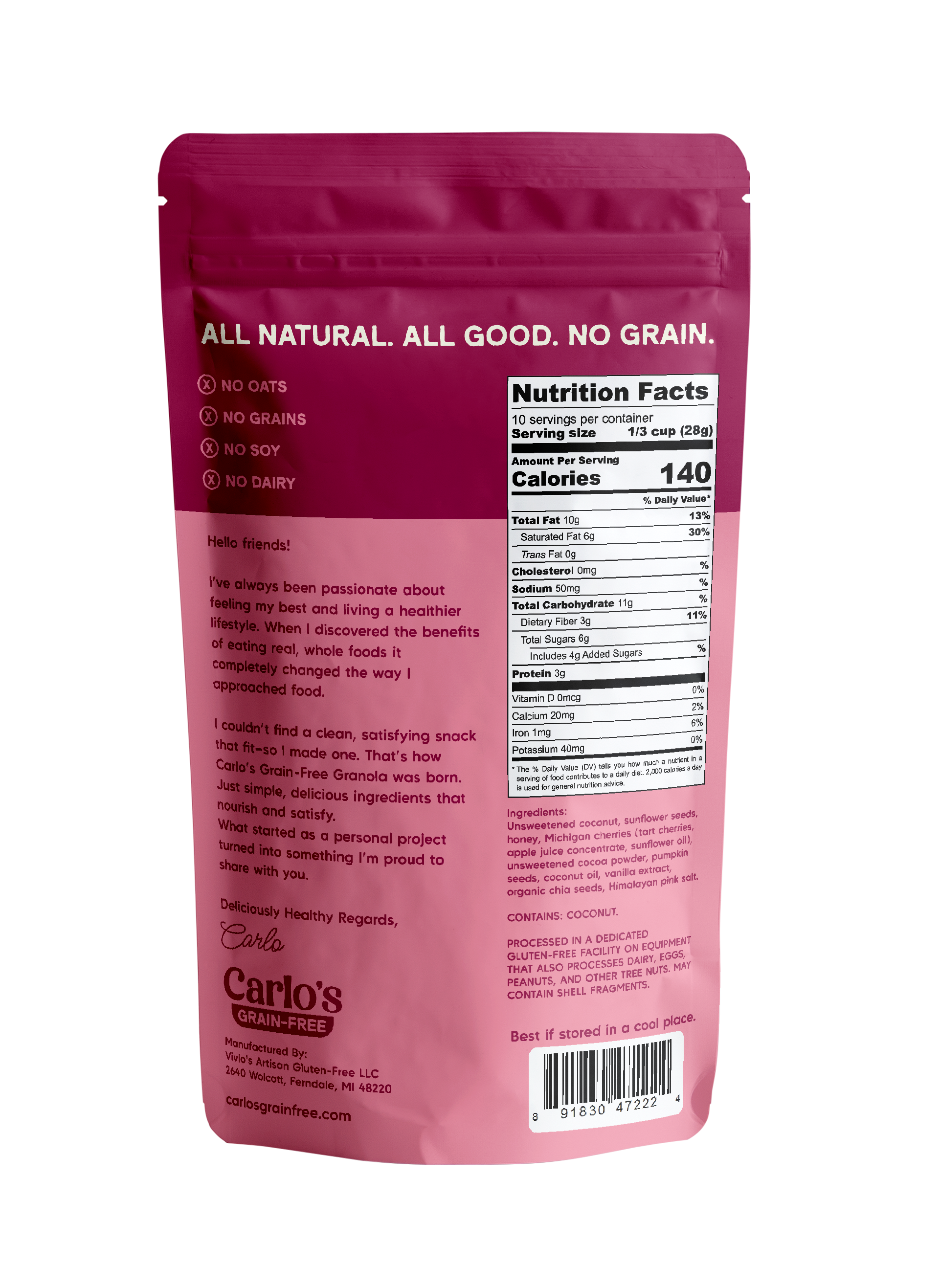 unsweetened coconut, sunflower seeds, honey, Michigan cherries (tart cherries, apple juice concentrate, sunflower oil), unsweetened cocoa powder, pumpkin seeds, coconut oil, vanilla extract, organic chia seeds, Himalayan pink salt.